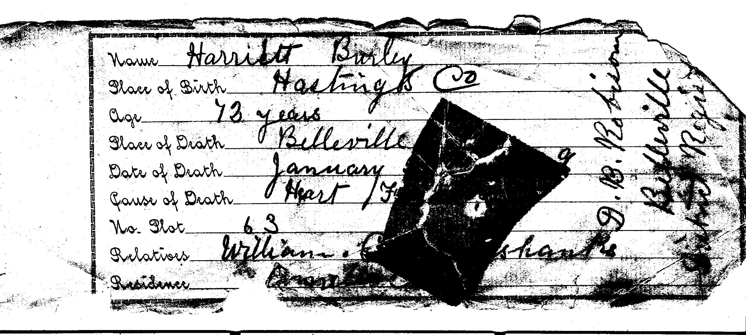 The Records are in a small book form, measuring about 2 cm by 9 cm (9-1/4" by 3-1/4") and it is all very yellow with age and very delicate. There were probably 175 pages originally. It looks like the last 15 pages have been lost. One repaired loose page was with it, which was scanned and is available here, (it is a biggy as you need the size to make it out). The writing across the page on the right hand side is: "D.B. Robison, Belleville, District Registor". These signatures began to show up in 1897. Prior to that the only side writing was "Fee Paid 10 ¢". The earliest date is February 22, 1886 and the latest is January 21, 1899.